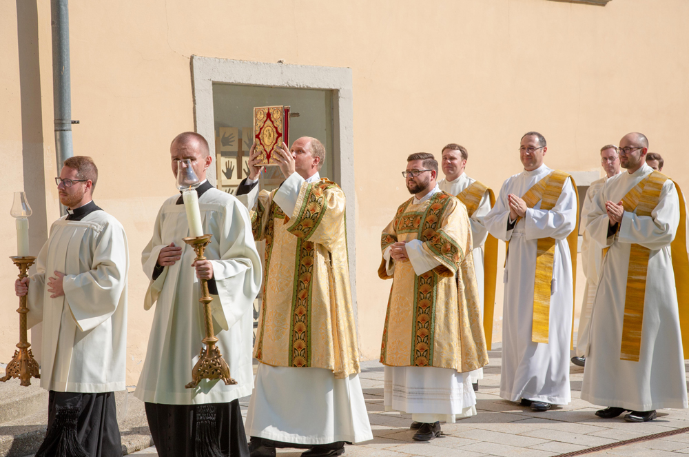 Am 24. Sonntag im Jahreskreis weihte Diözesanbischof Dr. Wilhelm Krautwaschl drei Diakone durch Handauflegung und Gebet zu Priestern. Aufgrund der laufenden Renovierung des Grazer Domes wurden Herr Mag. Elias Kraxner CRSA vom Chorherrenstift Vorau sowie Ing. Mag. Markus Schöck und Mag. Dominik Johannes Wagner in unserer Basilika geweiht. In der Predigt entfaltete Bischof Wilhelm für die Geweihten die erste Frage des Weiheritus: "Seid ihr bereit, das Priesteramt als zuverlässige Mitarbeiter des Bischofs auszuüben und so unter der Führung des Heiligen Geistes die Gemeinde des Herrn umsichtig zu leiten?". Viele Priester, Ordensleute, Familie, Freunde und Vertreter des öffentlichen Lebens waren gekommen um bei der Priesterweihe mitzufeiern und bei der anschließenden Agape zu gratulieren. Zur Aufzeichnung der Priesterweihe geht es hier.