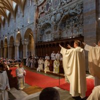 Am 11. Juli, dem Hochfest des heiligen Benedikt, hat Diözesanbischof Dr. Wilhelm Krautwaschl Abt Johannes die Abtsbenediktion erteilt. Dabei überreichte Bischof Wilhelm dem 8. Abt von Seckau Benediktsregel, Ring, Mitra und Stab. Aufgrund der geltenden Schutzmaßnahmen konnte nur eine begrenzte Anzahl von geladenen Festgästen in der Basilika an der Feier teilnehmen. Aus diesem Grund wurden die Abstbenediktion und das 1. Pontifikalamt, das Abt Johannes am "Benediktssonntag" mit der Pfarre feierte, auf unserem You-Tube-Kanal live übertragen. Bischof Wilhelm wies in seiner Predigt darauf hin, dass Abt Johannes erwählt wurde, einem "Vater" ähnlich die Gemeinschaft der Mönche auf dem Weg der Gottsuche zu halten und ermutigte ihn dabei am Kreuz unseres Herrn und Meisters Halt zu finden. Die vollständige Predigt ist hier nachzulesen. Am Schluss der Feier richteten der Direktor des Abteigymnasiums Mag. Wilhelm Pichler, Bürgermeister Dr. Marin Rath und Landeshauptmann Hermann Schützenhöfer herzliche Grußworte an den neugeweihten Abt. Nach der Abstbenediktion hatten alle Mitfeiernden die Gelegenheit Abt Johannes bei der Agape persönlich zu gratulieren.