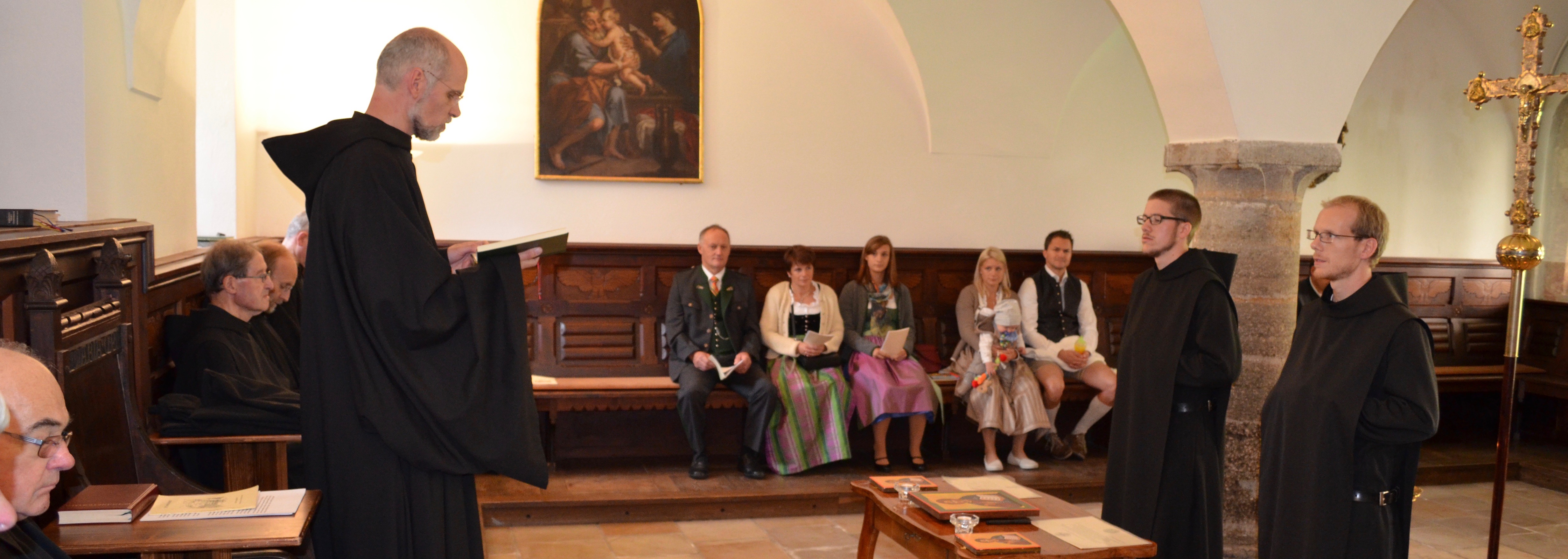Nach Ablauf dieser Zeit kann der Novize mit Zustimmung des Konventes zur zeitlichen Profess zugelassen werden und ein Versprechen für drei Jahre ablegen. Nach insgesamt etwa fünf Jahren ist es möglich, sich für ein Leben lang durch die ewigen Gelübde an Gott und die Gemeinschaft zu binden. Mit der feierlichen Profess ist die "Ausbildung" eines Mönches sicher nicht abgeschlossen, ist doch der vom Hl. Benedikt aufgezeigte Weg der Gottsuche ein andauernder Prozeß. Der Hl. Benedikt verschweigt in seiner Regel auch nicht die notwendigen Mühen, die mit diesem Weg verbunden sind. Zugleich schreibt er dazu am Ende seines Prologes jedoch die ermutigenden Worte: "Wer aber im klösterlichen Leben und im Glauben fortschreitet, dem wird das Herz weit und er läuft in unsagbarem Glück der Liebe den Weg der Gebote Gottes" (RB, Prolog 49).